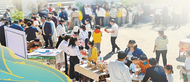 当日的广场不仅是展览现场,更是全民参与的文化游乐场。在“全民打卡·寻宝榆林”活动中,1000本印着榆林各博物馆标识的打卡手册引得市民争相申领。一旁的“镇北台拼图挑战”区域同样热闹非凡。印有镇北台残缺图景的拼图材料摆放在长桌上,参与者需在1小时内复原这座“万里长城第一台”的全貌。“这个拼图活动太有意思了!”和女儿一起完成拼图的市民叶艳笑着说,“这种沉浸式体验比单纯看图片更能让人记住镇北台的特色,希望以后能多举办这样的活动。”