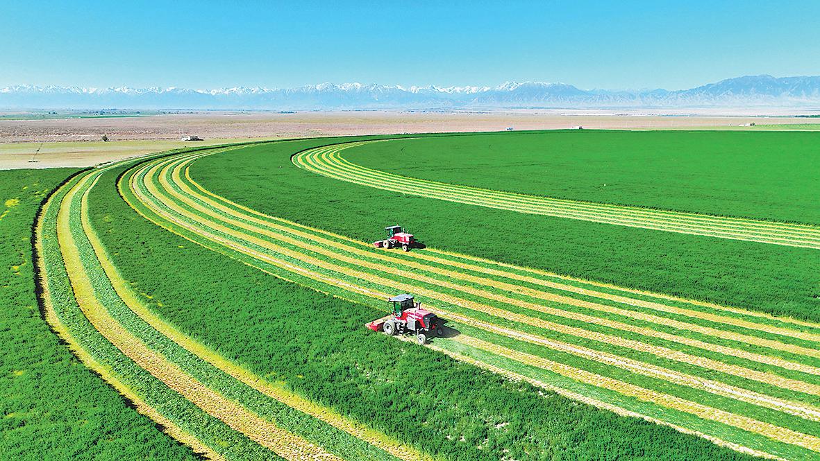 日前,甘肃省张掖市甘州区畜牧产业园内优质饲草基地里的苜蓿开始采收,大型饲草收割机、自走式粉碎机、运输车等来回穿梭,场面壮观。