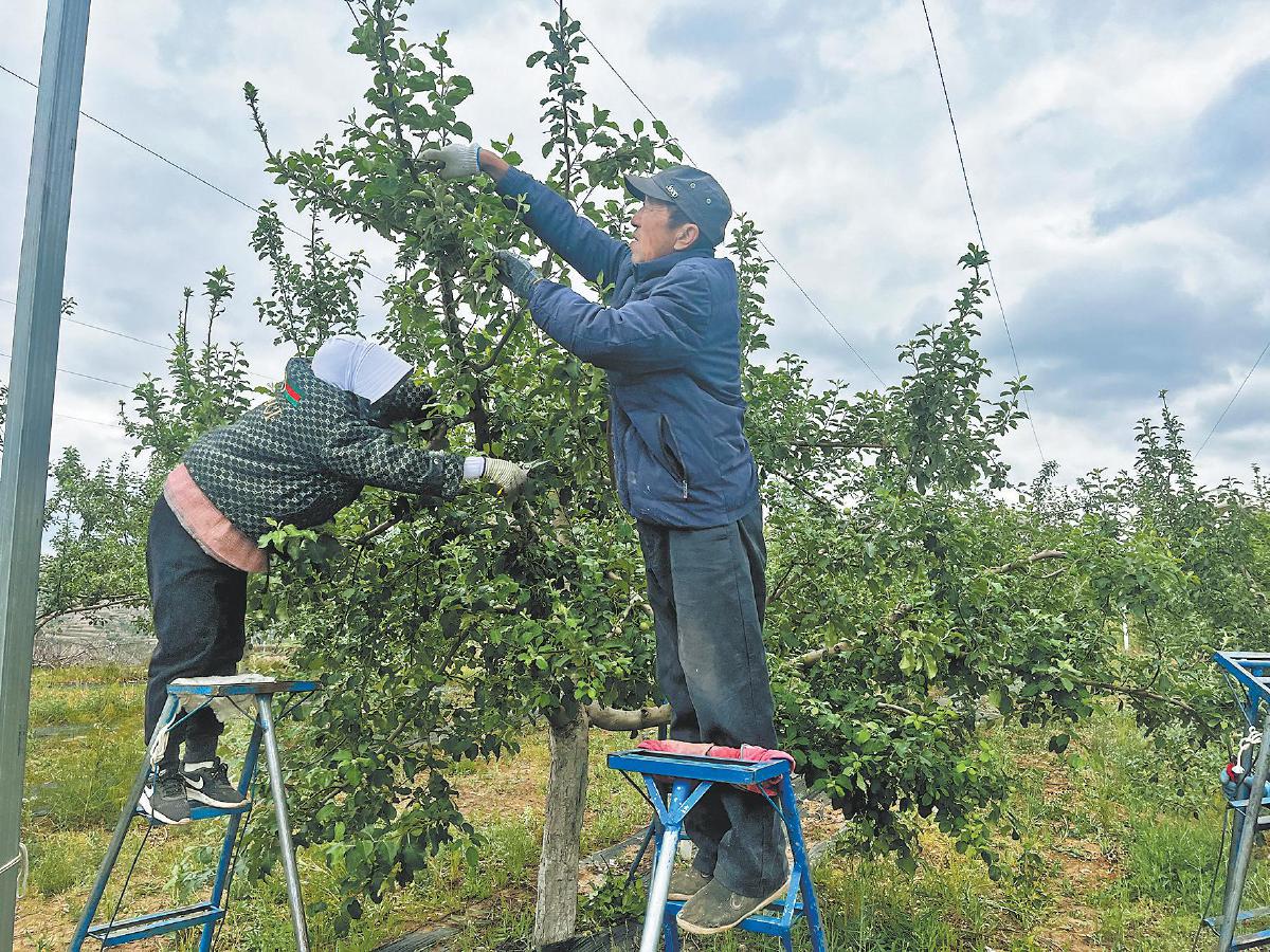 眼下,正是苹果树生长的关键时期。在清涧县宽州镇上刘家川村果农师串林300多亩的果园里,工人们正忙着给果树疏果。今年,清涧县大力推进山地苹果高标准管护,总面积10.8万亩,预计年产量可达2.3万吨,产值可达1.85亿元。