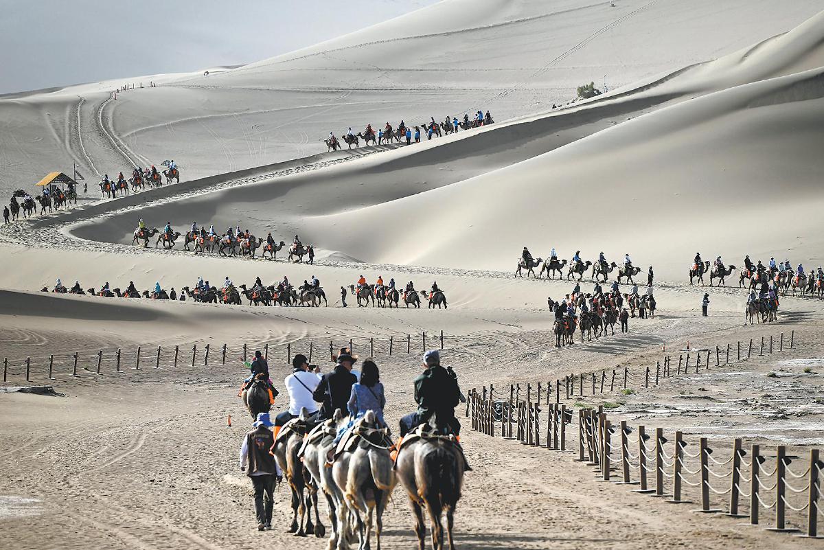 6月2日,游客在甘肃省敦煌市鸣沙山月牙泉景区游览。