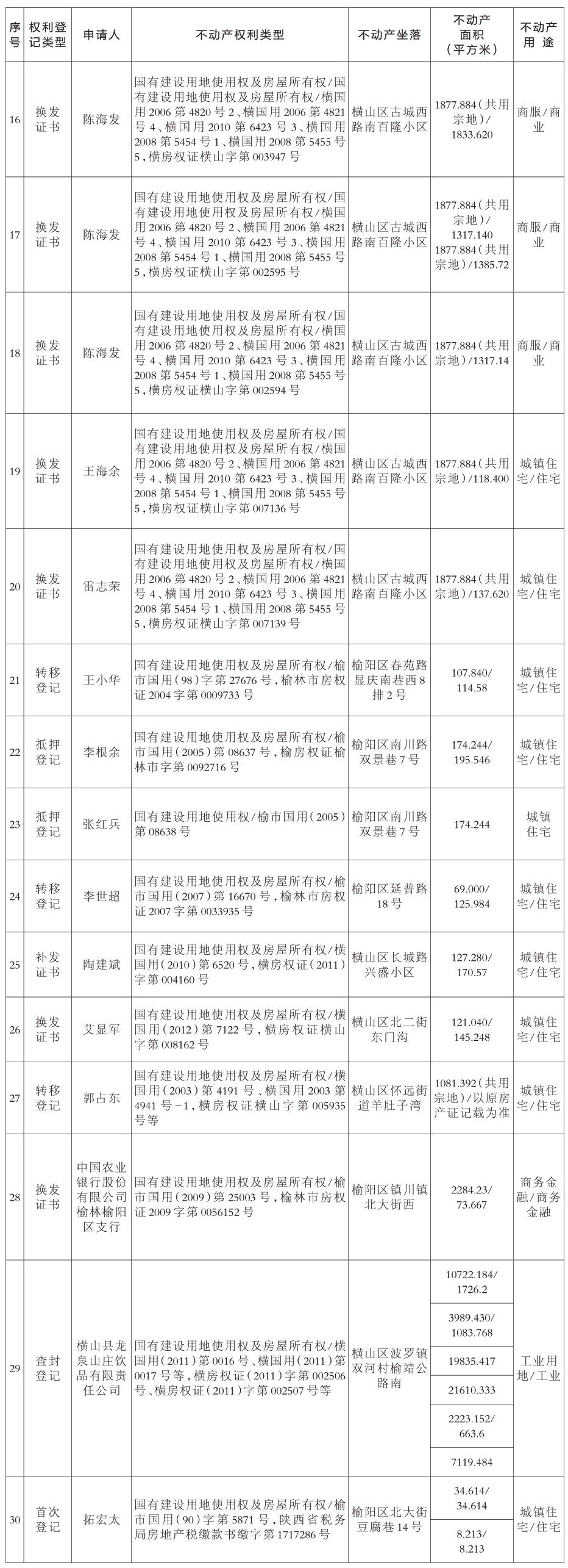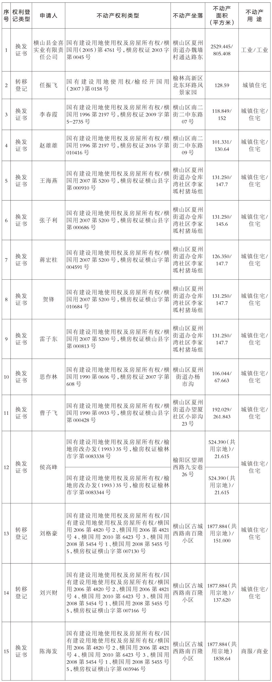经初步审核,我中心拟对下列不动产权利办理换发证书、转移登记、抵押登记、查封登记、首次登记不动产登记事项登记业务。根据《不动产登记暂行条例实施细则》第十七条的规定,现予以公告。如有异议,请自本公告发布之日起十五个工作日内将异议书面材料送达我中心。逾期无人提出异议或者异议不成立的,我中心将予以登记。