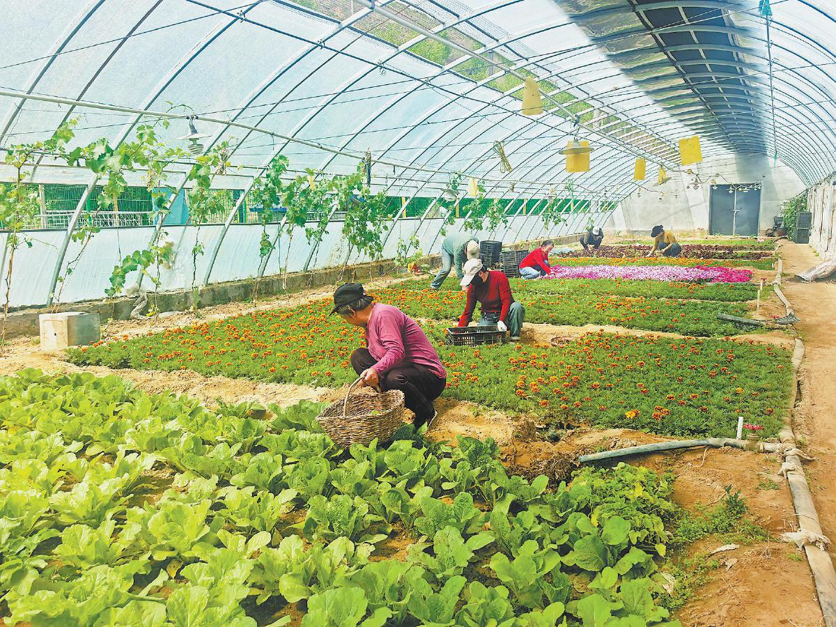 神木市乐森生态农业园林绿化有限公司的智能大棚内,工人们将成熟的花卉和蔬菜陆续装入筐中。陈静仁 摄