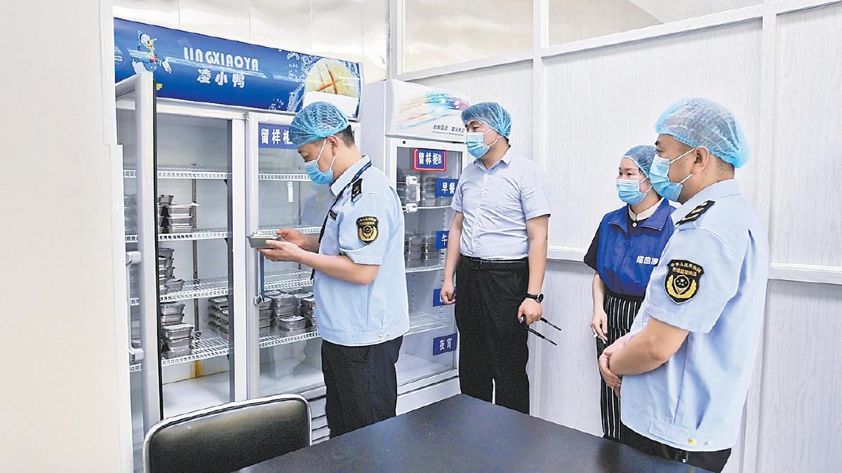 执法人员对考点食堂进行检查。白泓渊 摄