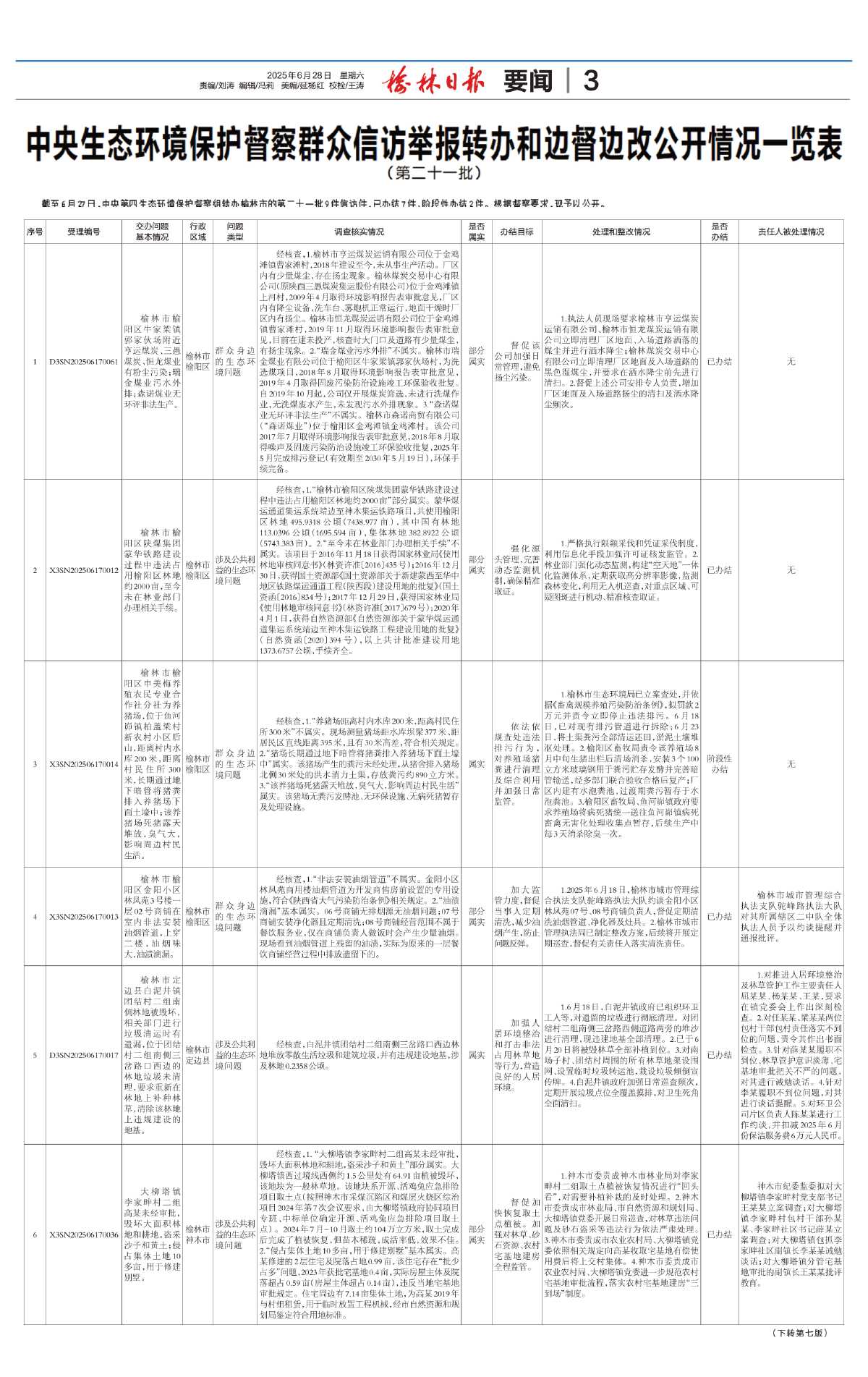 中央生态环境保护督察群众信访举报转办和边督边改公开情况一览表