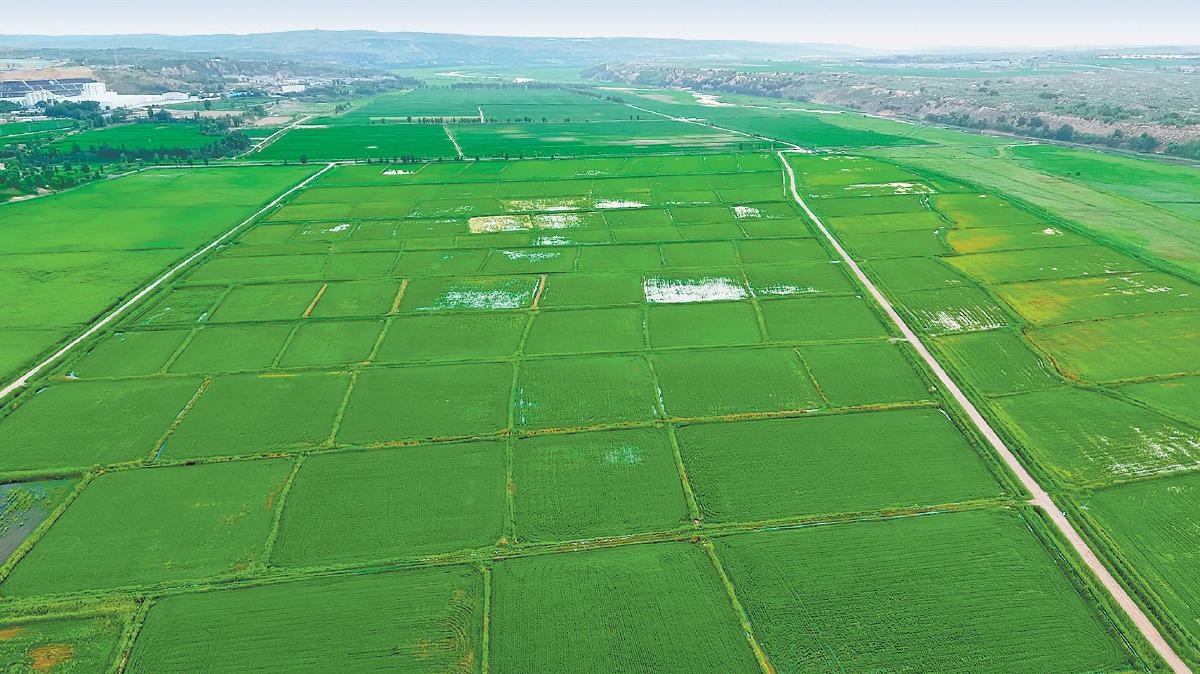图为7月13日拍摄的横山区无定河段波罗村万亩稻田(无人机照片)。记者 崔瑞妮 摄