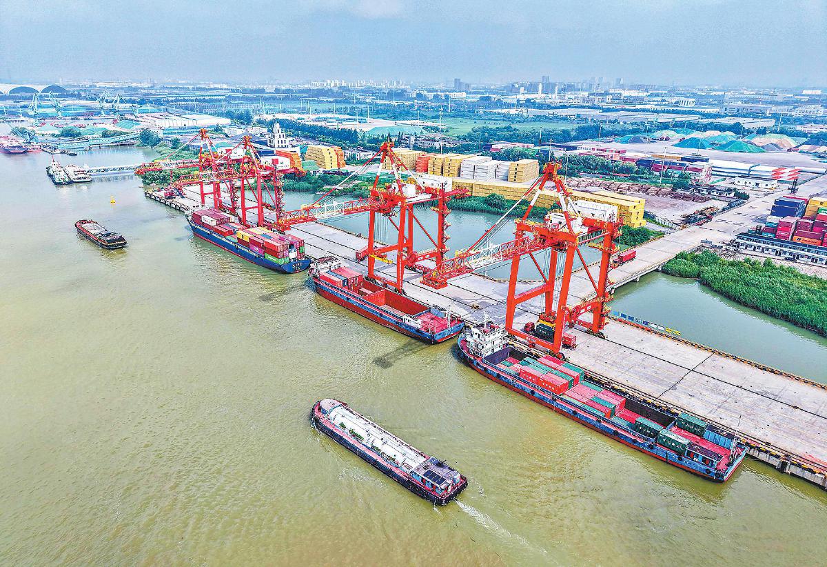 这是7月13日拍摄的江苏省扬州港作业场景(无人机照片)。