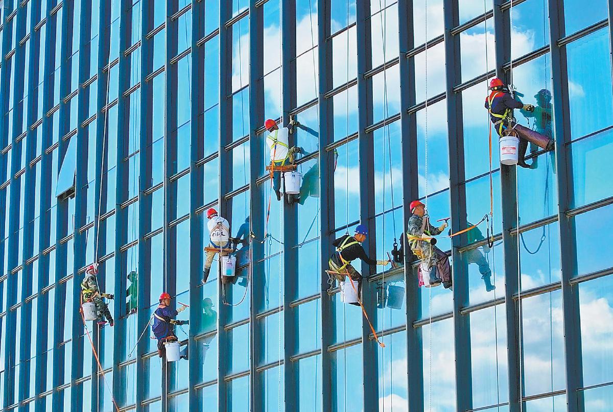 高空清洁工人们借助专业绳索,对高楼大厦的玻璃幕墙进行清洁作业,为城市美化贡献自己的力量,被人们亲切地称为“蜘蛛侠”。他们在擦亮城市建筑的同时,也成为一道独特的“风景线”。