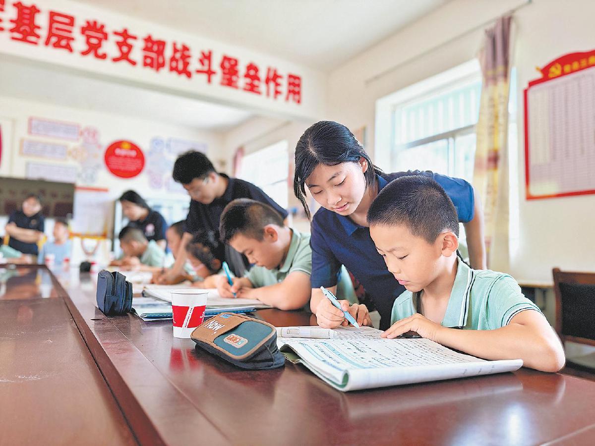 大学生志愿者为学生讲解难题。(市外事外经局驻赵寨村工作队供图)