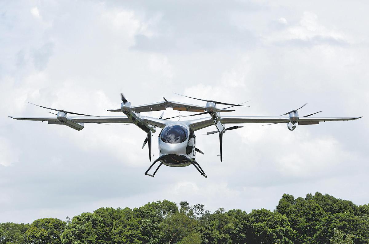 这是在飞行测试基地进行飞行演示的V2000CG凯瑞鸥电动垂直起降航空器(7月22日摄)。