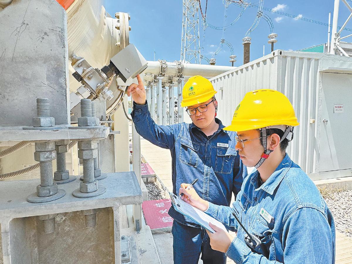 七月的陕北,骄阳似火,热浪扑面。国家电网±800千伏陕北换流站里,运维班安全员赵跃东头戴安全帽,正带领同事对换流变开展特巡特护。他们认真检查设备的运行状态,手中的记录笔不时标注着各种参数,对每一处细节都仔细核对。这是陕北换流站迎峰度夏期间,运维人员坚守岗位的缩影。