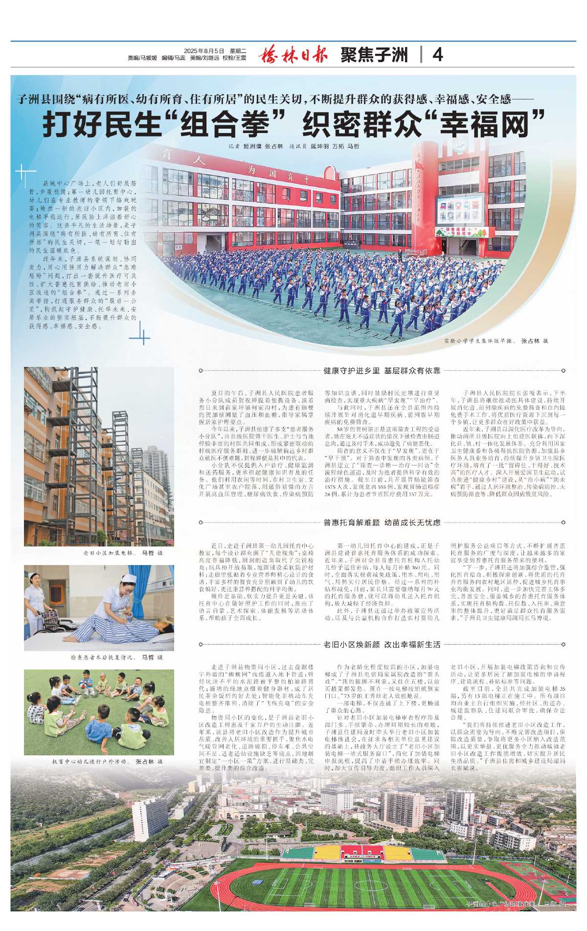 县城中心广场上,老人们舒展筋骨,步履稳健;第一幼儿园托育中心,幼儿们在专业教师的带领下嬉戏玩耍;焕然一新的老旧小区内,加装的电梯平稳运行,居民脸上洋溢着舒心的笑容。这些平凡的生活场景,是子洲县围绕“病有所医、幼有所育、住有所居”的民生关切,一笔一划勾勒出的民生温暖底色。