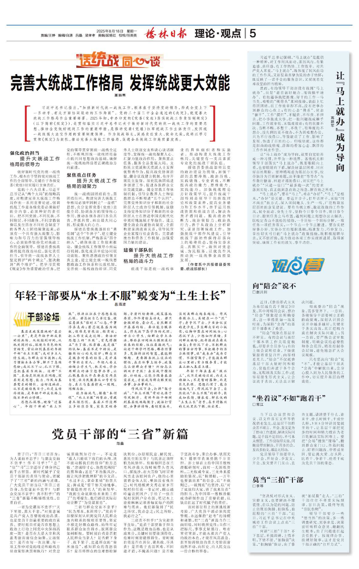 习近平总书记指出,“加强新时代统一战线工作,根本在于坚持党的领导,形成全党上下一齐动手、有关方面协同联动的工作局面”。党的二十届三中全会通过的《决定》,就完善大统战工作格局作出重要部署。 2025年初,中办印发的《党委(党组)落实统战工作责任制规定》(以下简称《规定》),是贯彻落实习近平总书记关于做好新时代党的统一战线工作的重要思想、推动全党做好统战工作的重要举措,是推动党委(党组)扛牢统战工作主体责任、发挥统一战线强大法宝作用的重要制度保障。作为统战部长,深感责任重大、使命光荣,我将以学习贯彻《规定》为契机,推动完善大统战工作格局,促进全县统战工作高质量发展。