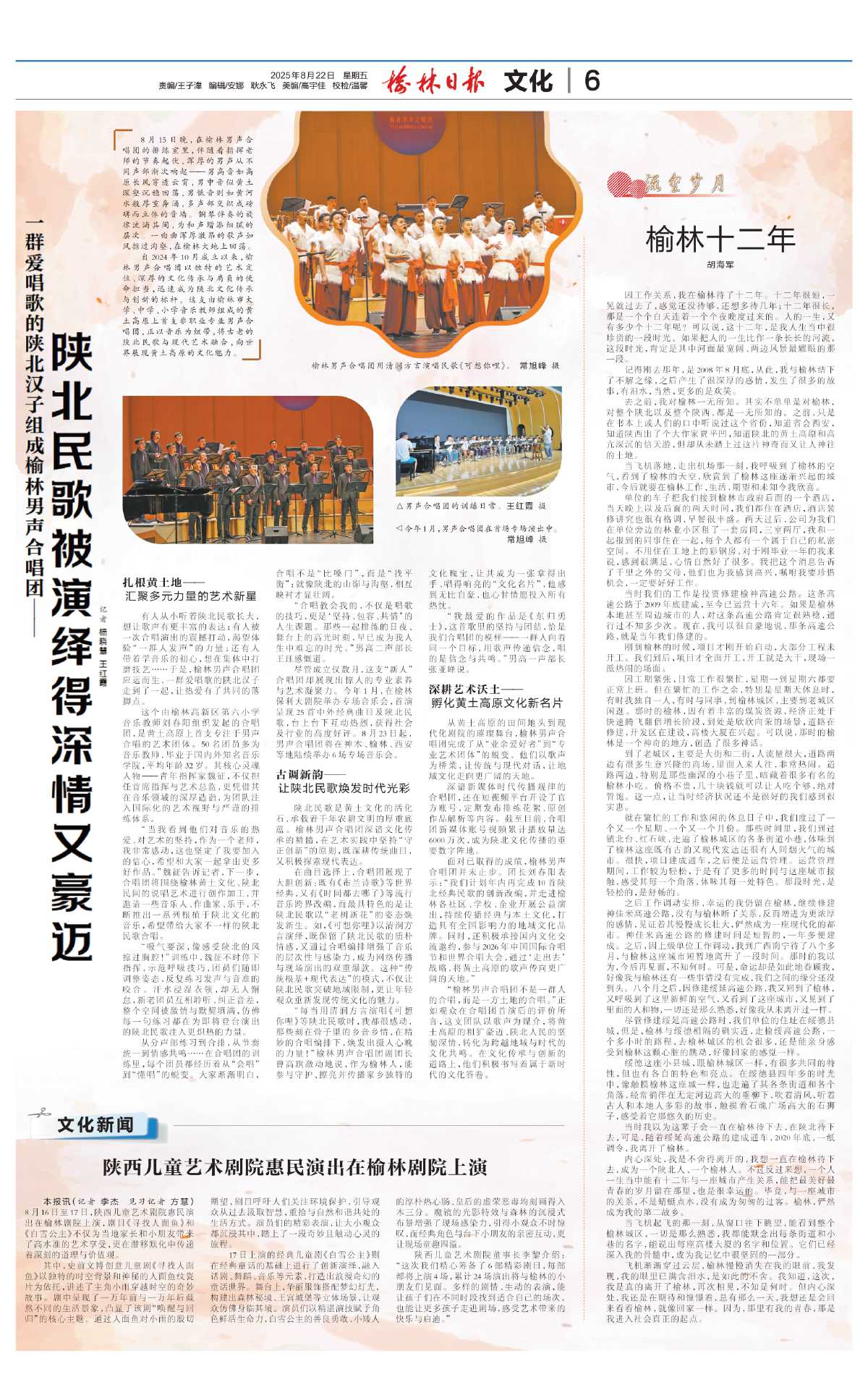 “每当用清涧方言演唱《可想你哩》等陕北民歌时,我都很感动,那些刻在骨子里的乡音乡情,在精妙的合唱编排下,焕发出摄人心魄的力量!”榆林男声合唱团副团长曹高旗激动地说,作为榆林人,能参与守护、擦亮并传播家乡独特的文化瑰宝,让其成为一张拿得出手、唱得响亮的“文化名片”,他感到无比自豪,也心甘情愿投入所有热忱。