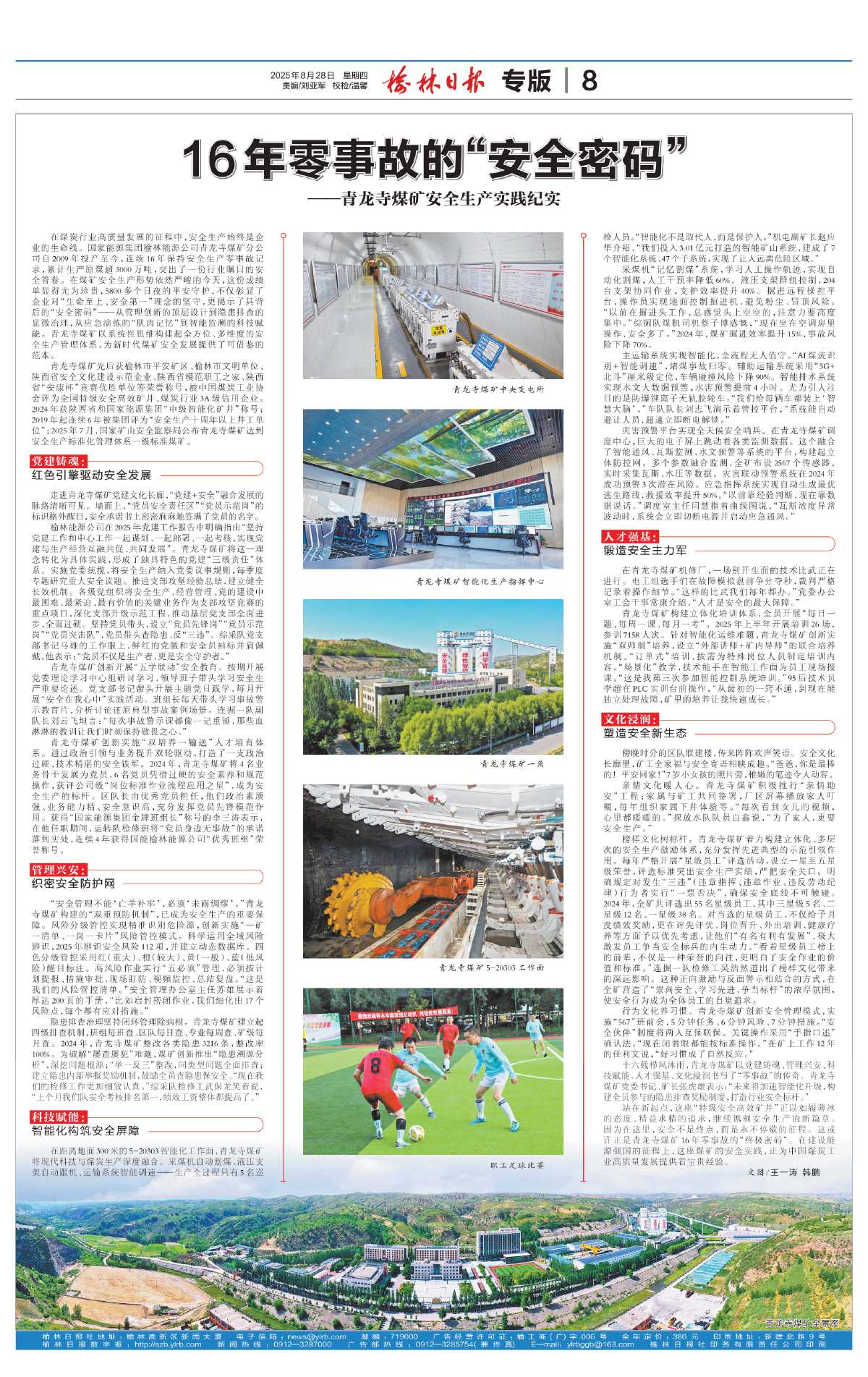 十六载栉风沐雨,青龙寺煤矿以党建铸魂、管理兴安、科技赋能、人才强基、文化浸润书写了“零事故”的传奇。青龙寺煤矿党委书记、矿长张虎雄表示:“未来将加速智能化升级,构建全员参与的隐患排查奖励制度,打造行业安全标杆。”