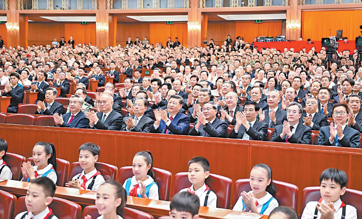 9月3日,纪念中国人民抗日战争暨世界反法西斯战争胜利80周年文艺晚会《正义必胜》在北京人民大会堂隆重举行。习近平、李强、赵乐际、王沪宁、蔡奇、丁薛祥、李希、韩正等党和国家领导人,与约6000名中外人士一起观看晚会。新华社记者 李响 摄