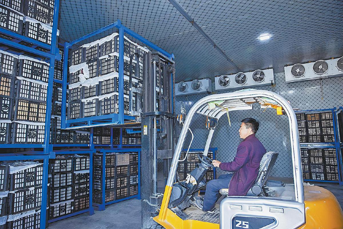 村民将包装好的青梨存放保鲜