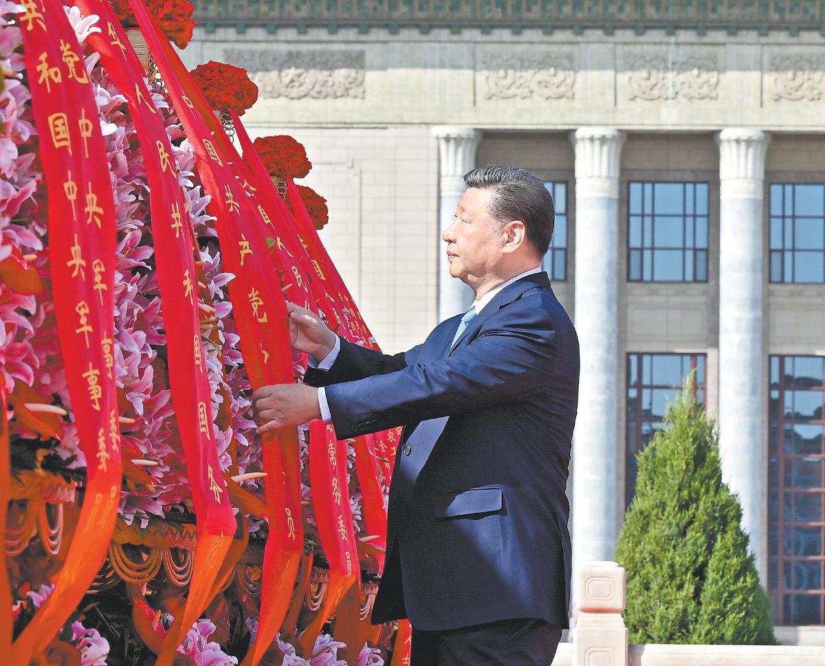 习近平迈步上前,仔细整理花篮缎带。随后,习近平等党和国家领导人缓步绕行,瞻仰人民英雄纪念碑。