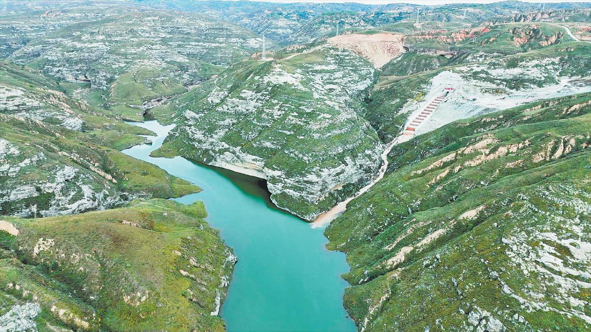 9月29日,黄河水正源源不断地注入黄石沟水库(无人机照片)。 庞亚飞 摄