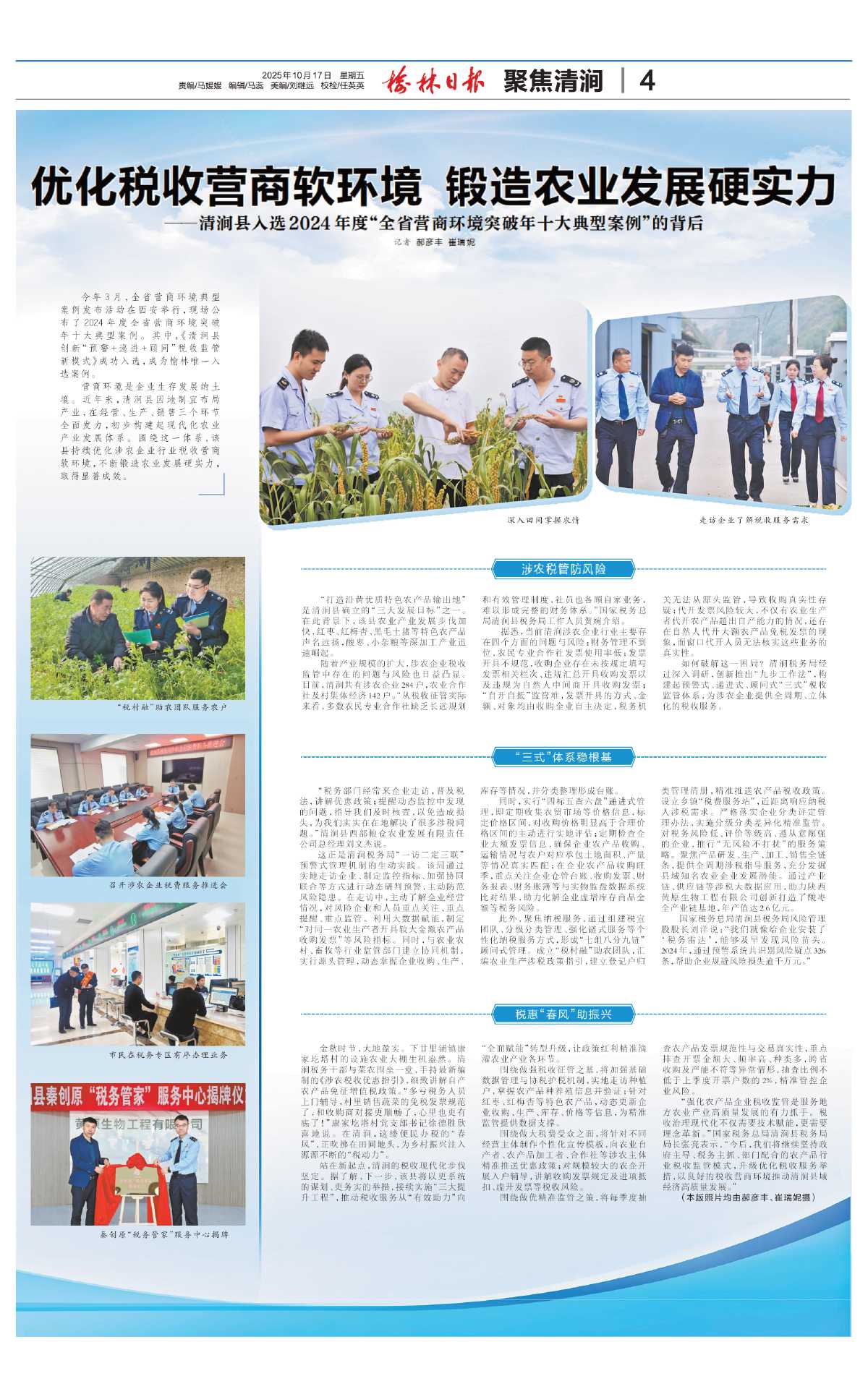今年3月,全省营商环境典型案例发布活动在西安举行,现场公布了2024年度全省营商环境突破年十大典型案例。其中,《清涧县创新“预警+递进+顾问”税收监管新模式》成功入选,成为榆林唯一入选案例。