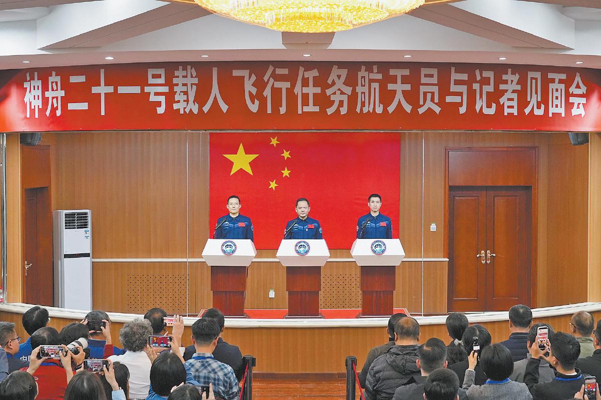 10月30日,神舟二十一号载人飞行任务航天员张陆(中)、武飞(右)、张洪章在酒泉卫星发射中心问天阁与媒体记者集体见面。新华社记者 李明刚 摄