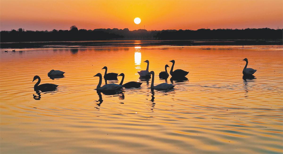 11月3日傍晚,榆林河口湿地,夕阳余晖将湖水浸染成一片绯红,一群天鹅在湖面上舒展身姿,或引颈游弋,尾尖轻拨粼粼波光;或静立浅滩,身影与橘红的天际悄然相融,铺展出一幅炽烈而静谧的自然长卷。