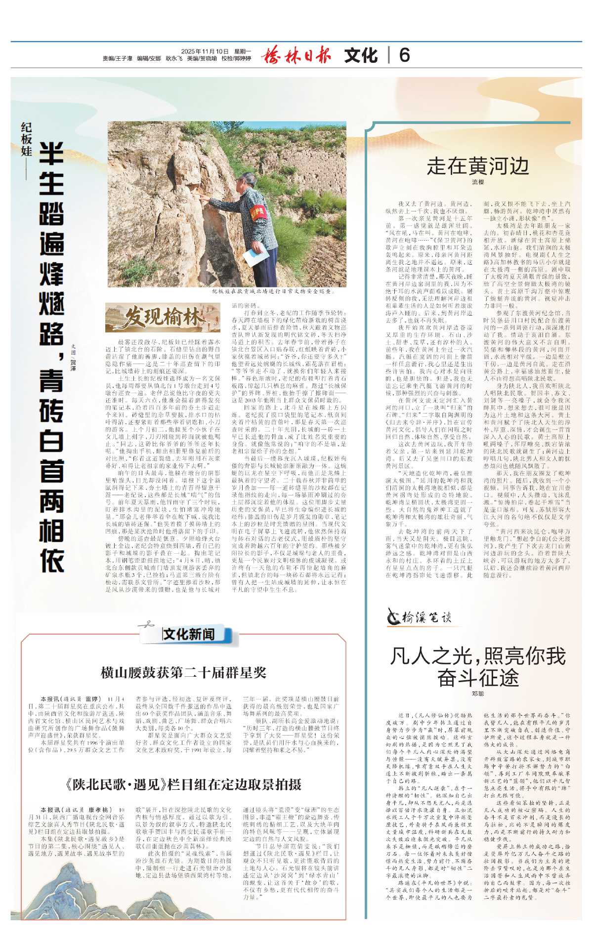 此次拍摄的“灵魂线索”,当属治沙英雄石光银。为期数日的拍摄中,摄制组一行走进石光银治沙基地、定边县盐场堡镇西梁湾村等地,通过镜头将“荒漠”变“绿洲”的生态图景,非遗“霸王鞭”的豪迈舞姿、传统刺绣的精细工艺,以及大块羊肉的特色风味等一一呈现,立体展现定边的自然与人文风貌。