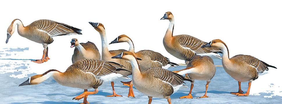 雁属中的“大块头”,上体灰褐色,从嘴基至额有宽阔白斑,下体白色杂黑色块斑,喜群居,迁徙时是湿地中最壮观的“空中编队”。