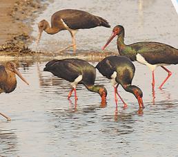 大型涉禽,灰白相间的体羽如“水墨画”,胸颈前灰、初级飞羽黑,红色的脚爪立于定边盐湖湿地的浅滩,鸣声高亢如号角。繁殖于东北湿地,越冬于鄱阳湖,榆林是它们迁徙途中的“补给站”,杂食性的它既食草根也捕鱼虾。