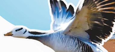 灰褐色的体羽如大地底色,头颈部纯白,头顶两道黑色带斑宛如“墨色发带”,在白色背景下格外醒目。偏爱禾本科、莎草科植物的叶与茎,常在红碱淖、无定河、河口的水草间觅食,集群飞行时队列整齐。