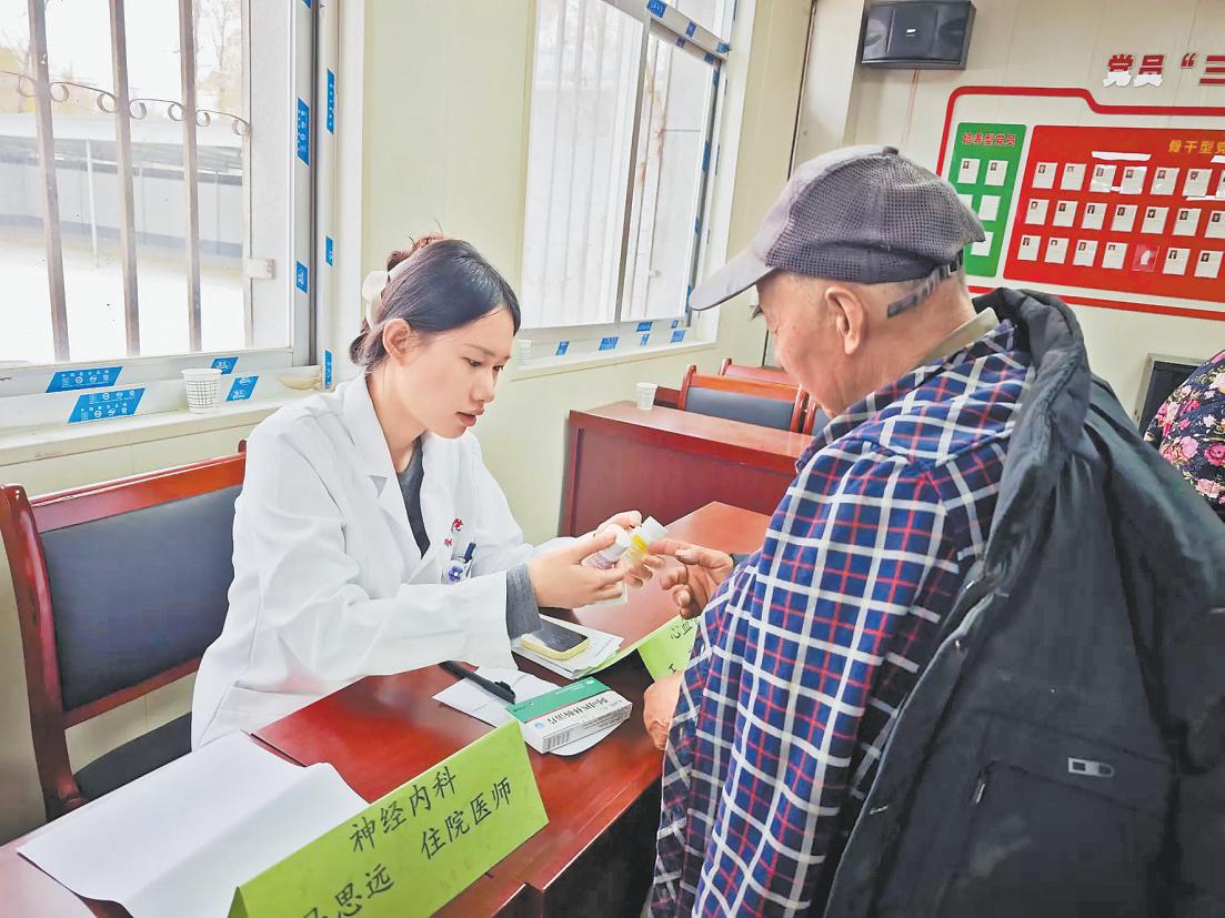 近日,榆林市星元医院医技党支部组织医疗服务队,走进榆阳区巴拉素镇忽惊兔村开展义诊活动,将优质医疗服务送至村民身边。这是医护人员为村民讲解用药方法。