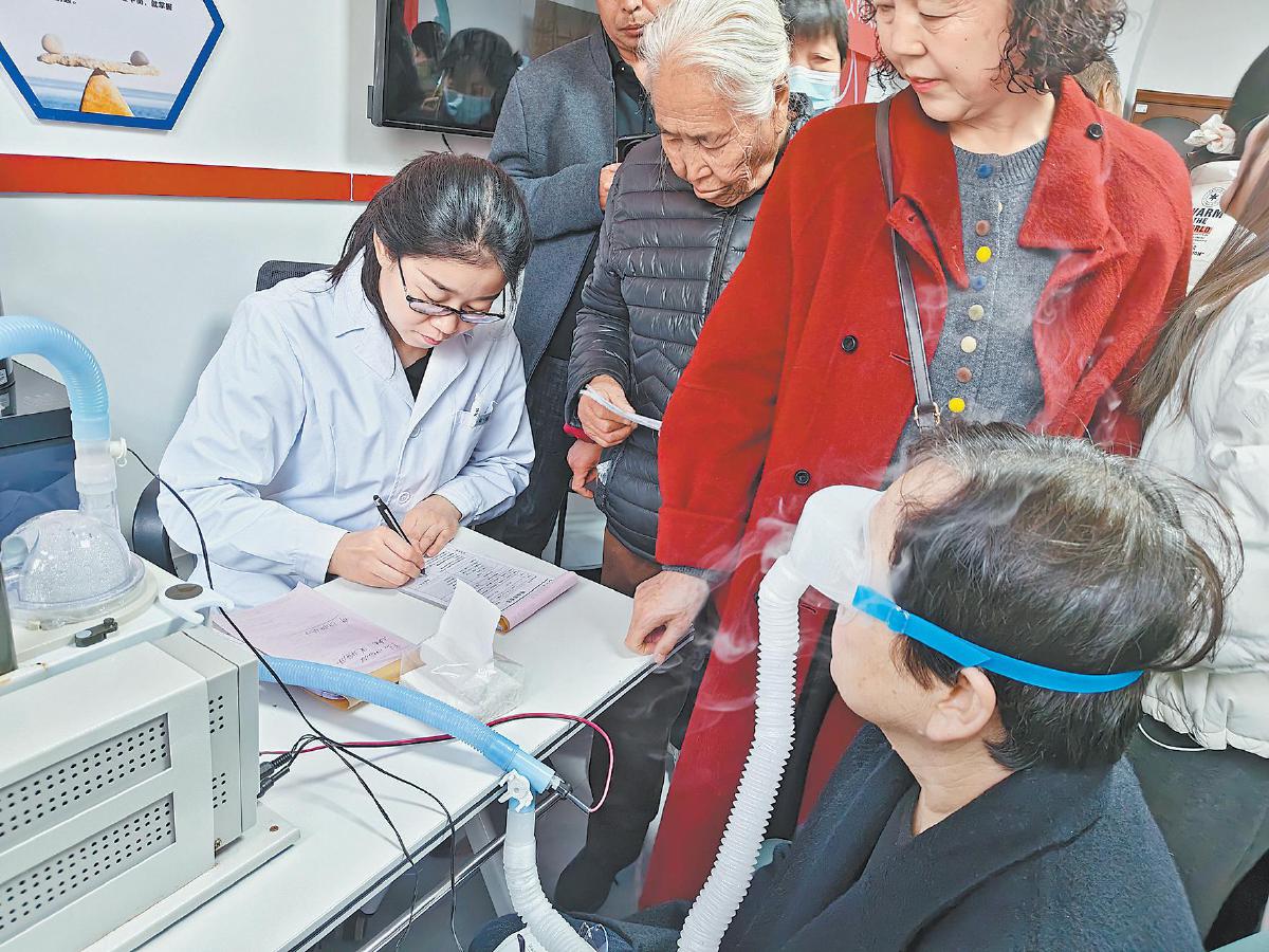图为医务工作人员正在为居民做眼部检查。