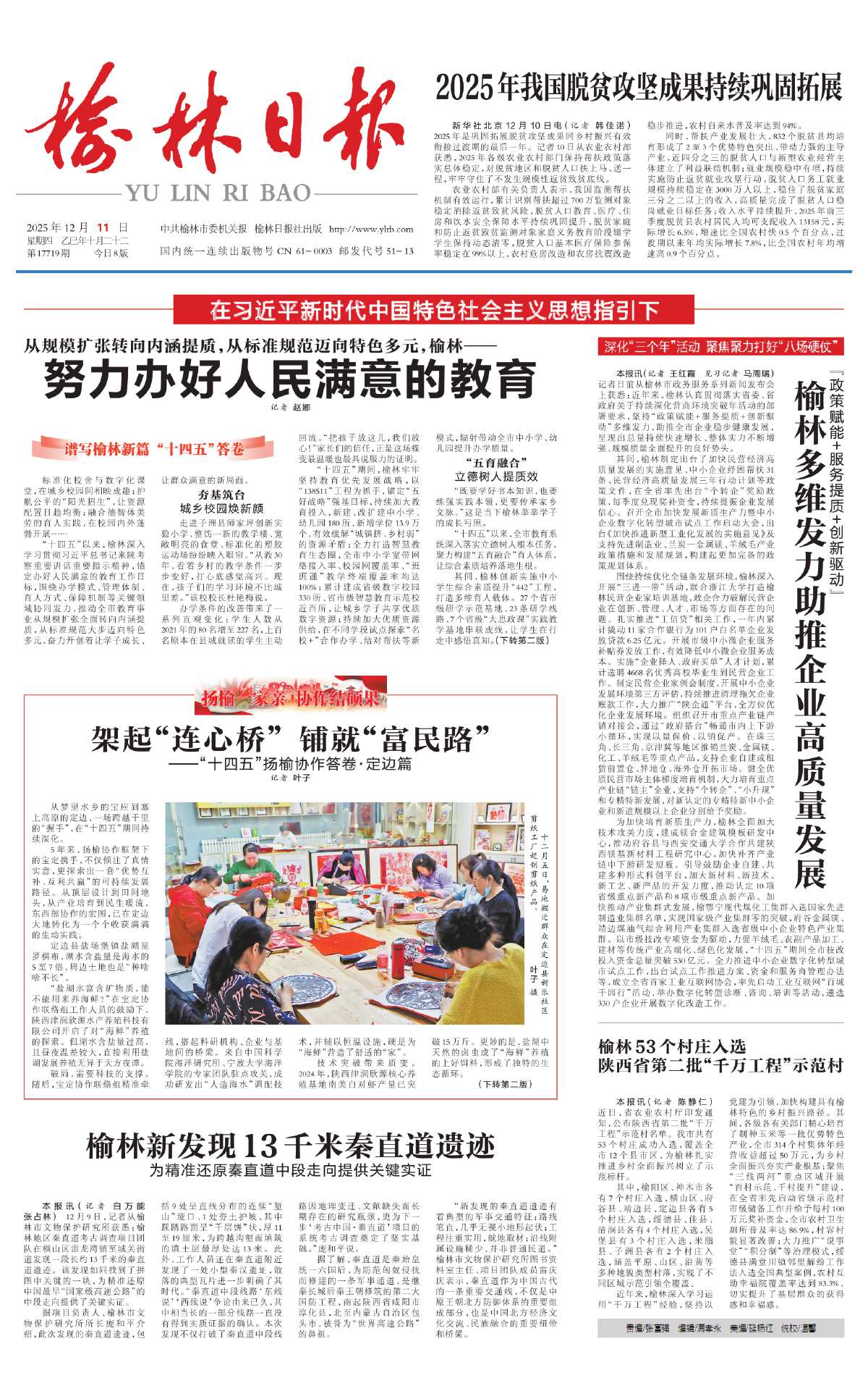 近年来,榆林深入学习运用“千万工程”经验,坚持以党建为引领,加快构建具有榆林特色的乡村振兴路径。其间,各级各有关部门精心培育了制种玉米等一批优势特色产业,全市314个村集体年经营收益超过50万元,为乡村全面振兴夯实产业根基;聚焦“三线两河”重点区域开展“百村示范、千村提升”建设,在全省率先启动省级示范村市级储备工作并给予每村100万元奖补资金,全市农村卫生厕所普及率达86.9%,村容村貌显著改善;大力推广“说事堂”“积分制”等治理模式,绥德县满堂川镇邻里解纷工作法入选全国典型案例,农村互助幸福院覆盖率达到83.3%,切实提升了基层群众的获得感和幸福感。