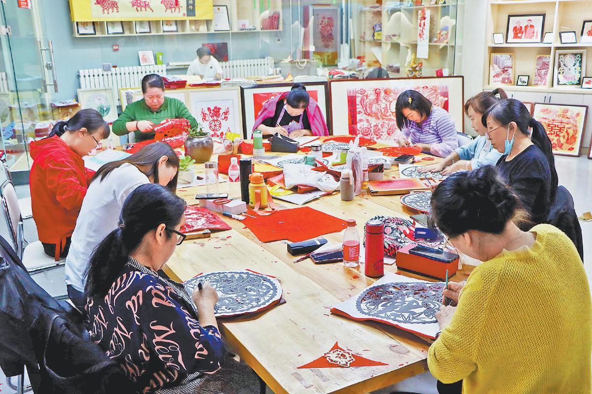 十二月五日,易地搬迁群众在定边县新乐社区剪纸工厂赶制剪纸产品。 叶子 摄