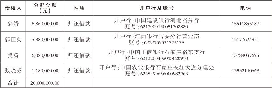 我公司神木市海孚开源生态治理有限公司,是原开源煤矿采空沉陷区及火灾隐患区综合治理项目的治理主体。根据神木市政府统一部署,我公司已于2022年与陕西神木能源集团有限公司签署了《中鸡镇李家畔村开源煤矿采空沉陷区及火灾隐患区综合治理项目主体剥离退出协议》。现我公司申请能源集团依据上述协议支付此次补偿款2000万元(附补偿款拟分配方案)。该方案中所列示的款项是开源项目在治理过程中形成的税款以及为了支付原矿股东补偿款、当地村民的占地补偿款、项目施工费等原因而形成的债权。此次补偿款现拟向下列债权人支付。拟分配方案如下: