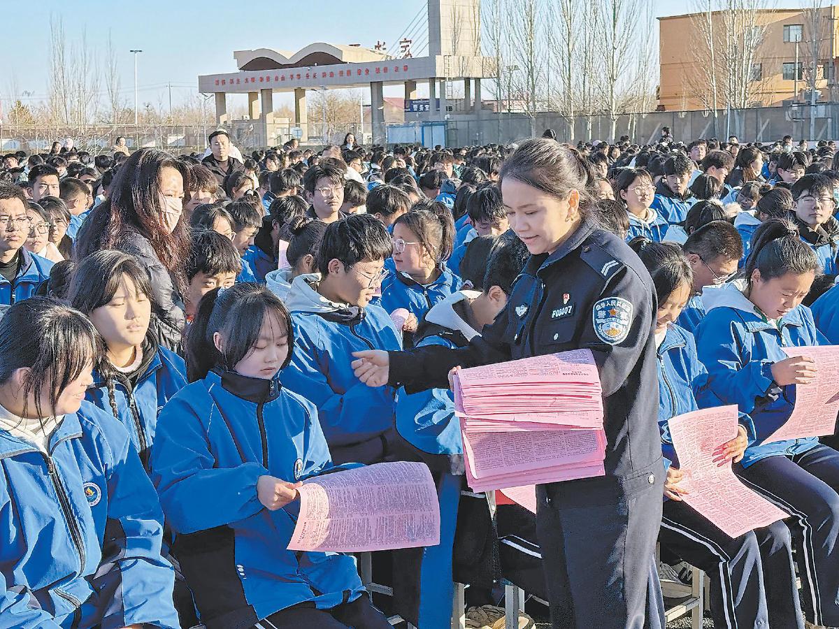 12月8日,民警在定边县职教中心向学生们发放宣传资料。陈春苗 摄