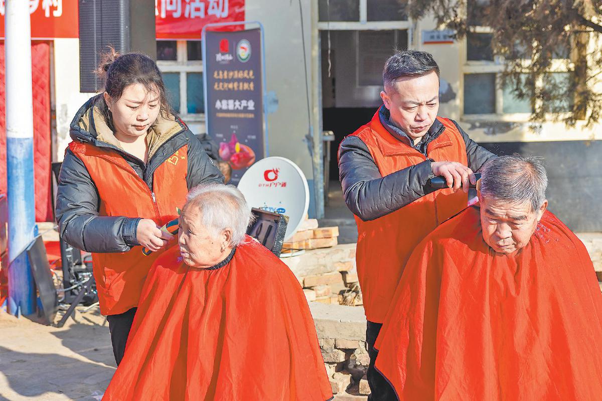 党梅(后排左)和志愿者一起为老人们义务理发。通讯员 李万宏 摄