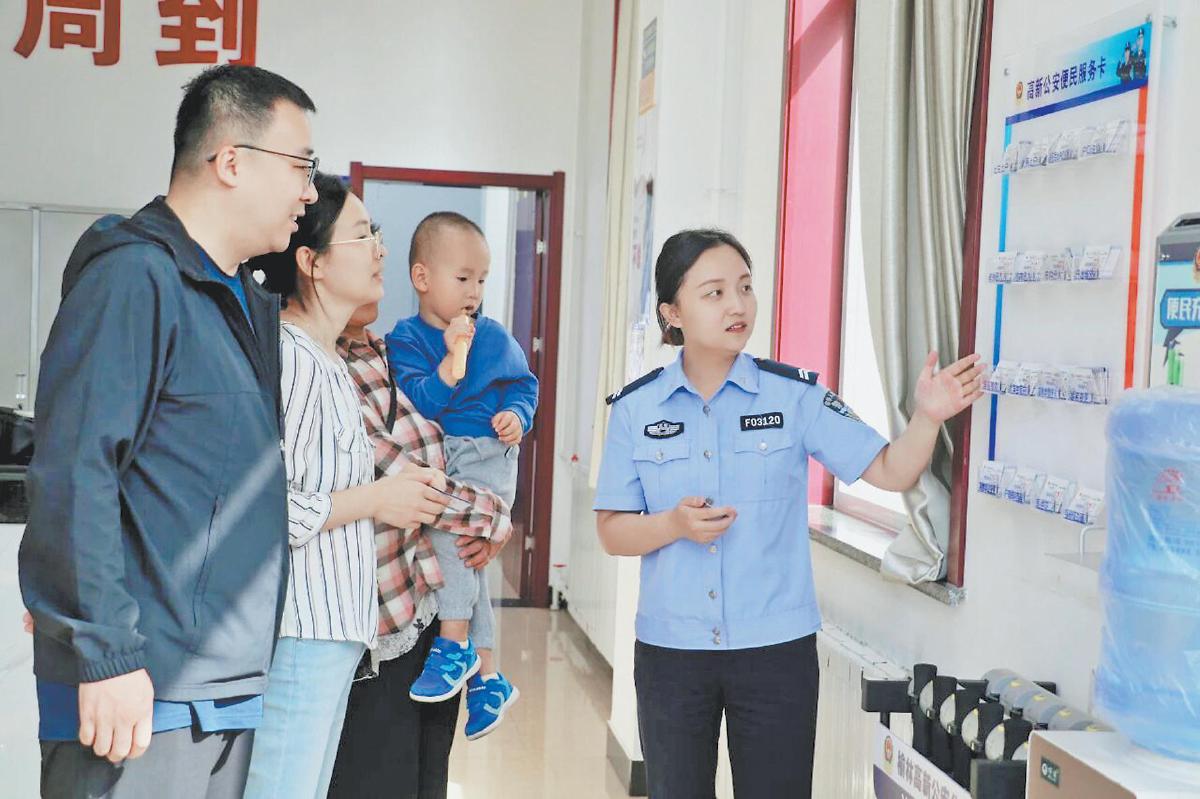 沙河路派出所户籍辅警向群众介绍印有不同户籍业务办理注意事项的“便民服务卡”使用方法(资料照片)。