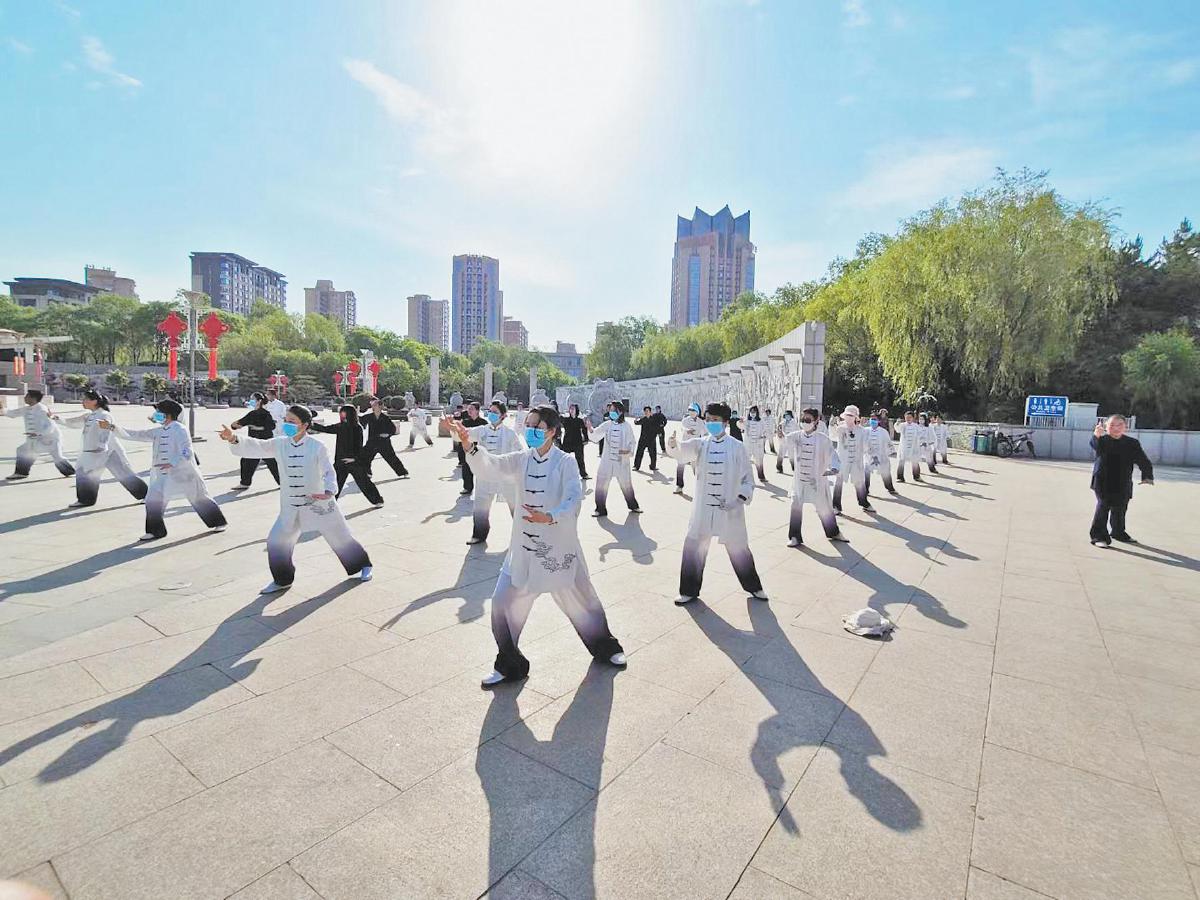 学员们在榆林高新区阳光广场练习太极拳。 钟文玲 摄