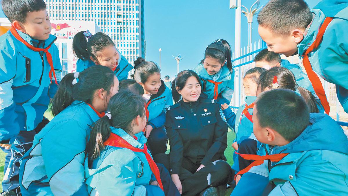 连日来,公安高新分局组织民辅警深入中小学校及幼儿园开展“金盾护苗”安全教育宣传活动。这是12月23日,沙河路派出所社区民警在榆林高新区第三小学操场上和学生们互动。记者 王婷 摄