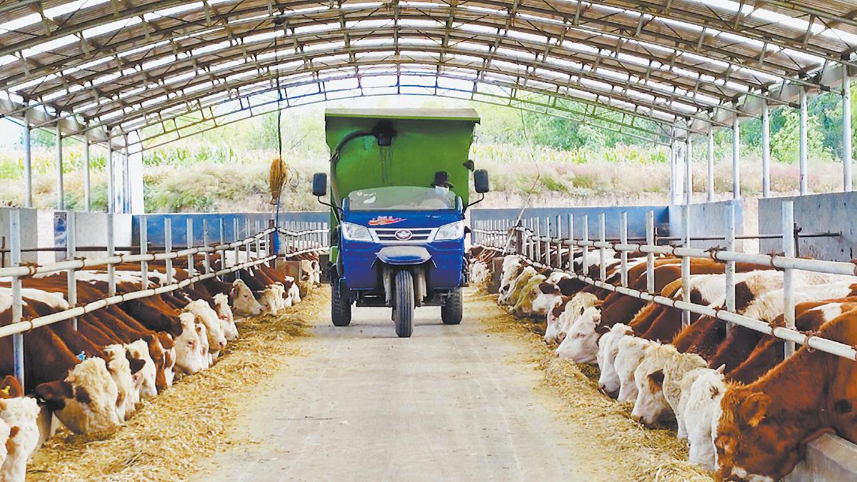在马兴庄村肉牛养殖基地,工作人员驾驶喂料机给肉牛投喂玉米秸秆(9月30日摄)。 张丹 摄