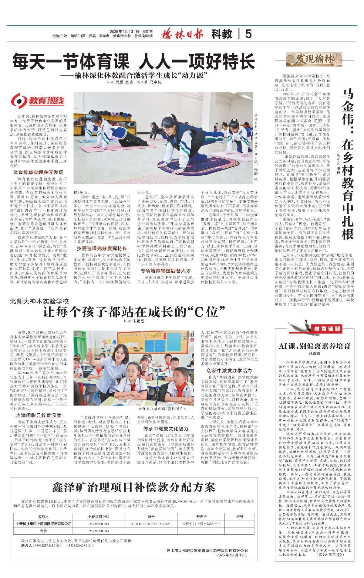 体育教育的蓬勃发展,离不开有力的政策支持。榆林出台了加强全市中小学生体质健康的六条措施,全面实施每天1节体育课、课间15分钟、30分钟大课间等措施,保障每天综合体育活动不低于2小时。各中小学积极推进“课间微改革”,一体化设计多样化、个性化课间活动和课后服务课程,将中华武术、陕北秧歌、横山老腰鼓等非遗项目融入体育活动,推动“健康第一”从理念到实践的深度转变。
