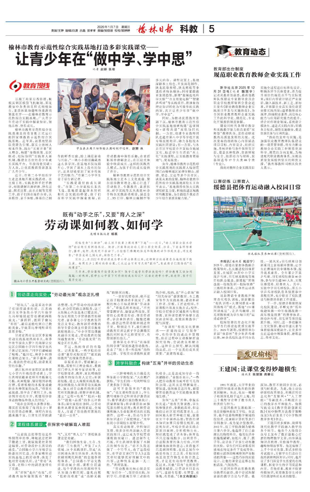 如何“五育”并举,章振乐补充道:“德育光靠说教,学生很难懂责任、奉献的真谛,但让他们去社区慰问孤寡老人、去田间地头俯首种植庄稼,就能在实干中涵养品德;智育的课本知识如果只停留在纸面,就是死知识,可结合劳动实践去算农田面积、分析植物生长,知识就变成了活本事;体育也不只是操场跑步,田间劳作、公益服务里的体力付出,同样能锤炼体能和意志;美育也不只是画画唱歌,在技艺制作中感受传统工艺之美、在校园农场里欣赏作物生长的自然之美,才是更生动的审美教育。反过来,其他‘四育’也能给劳动教育赋能,让劳动不只是出力气,还能有思想、有智慧、有体魄、有美感。”(本文有删减)