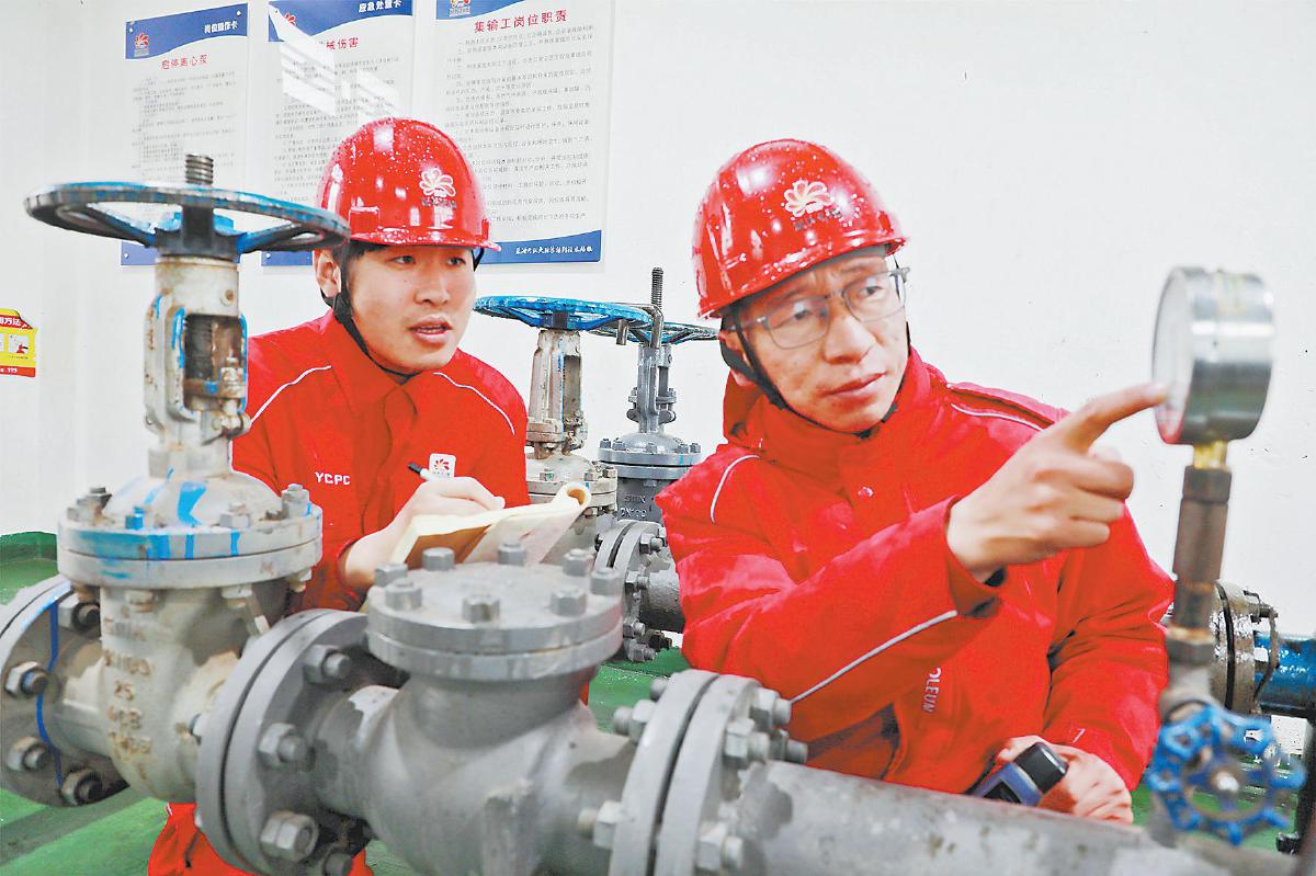 图为靖边采油厂职工读取转油泵压力表安全附件的数值,点对点识别潜在风险。