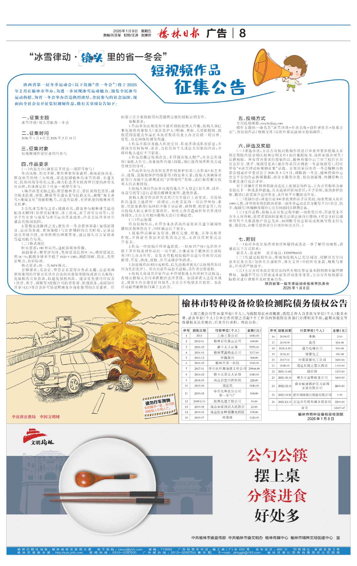陕西省第一届冬季运动会(以下简称“省一冬会”)将于2026年2月在榆林市举办,为进一步展现冰雪运动魅力、激发全民冰雪运动热情,为省一冬会举办营造热烈浓厚、全民参与的社会氛围,现面向全社会公开征集短视频作品,将有关事项公告如下: