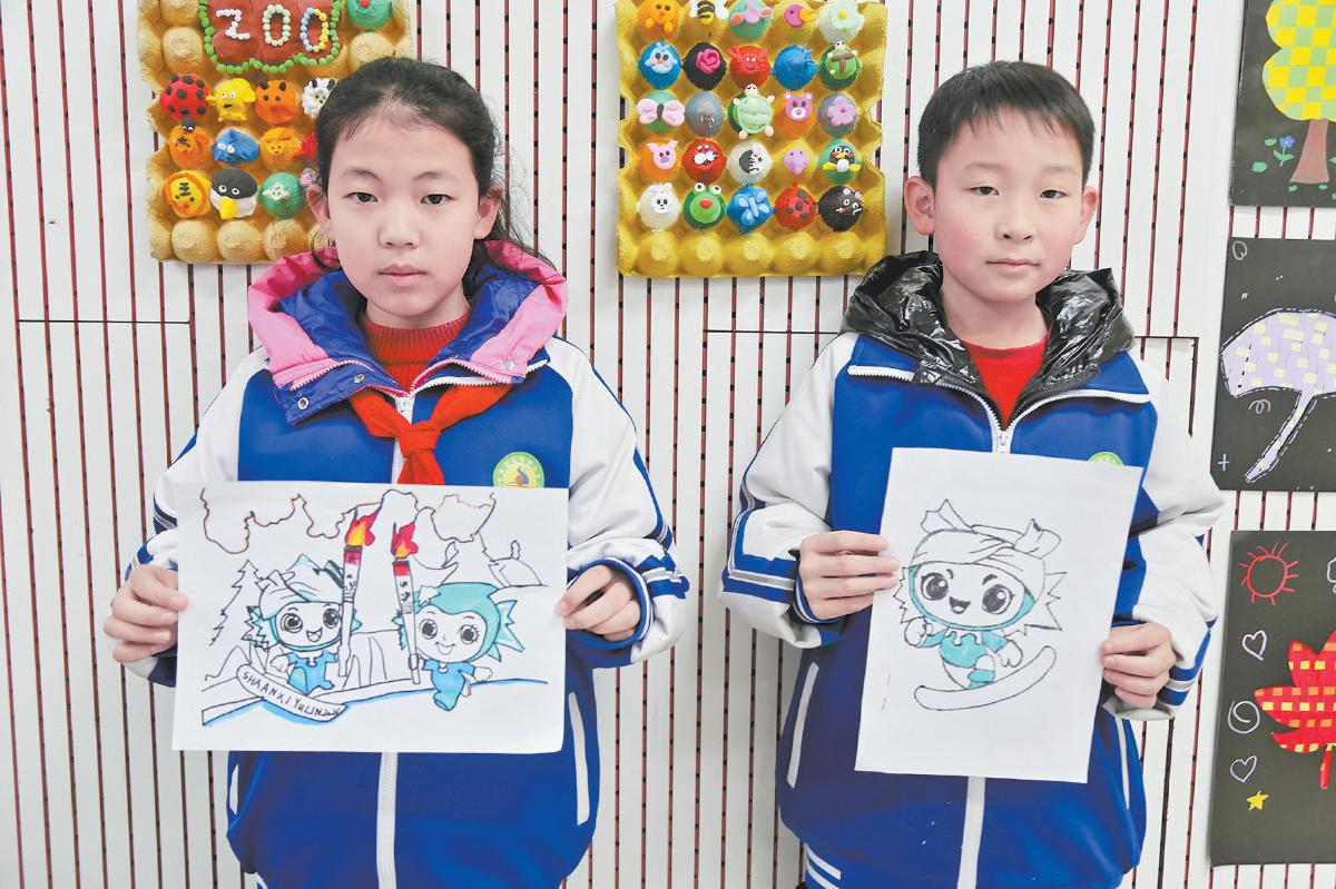 图为同学们展示自己手绘的省一冬会吉祥物。 张建雄 摄
