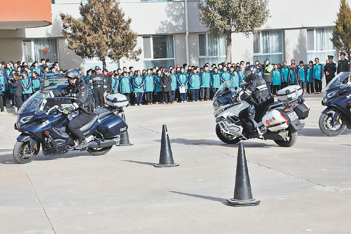 1月9日,公安横山分局走进横山区第五中学,开展“110警察节”主题宣传活动。这是铁骑队员在展示技能。