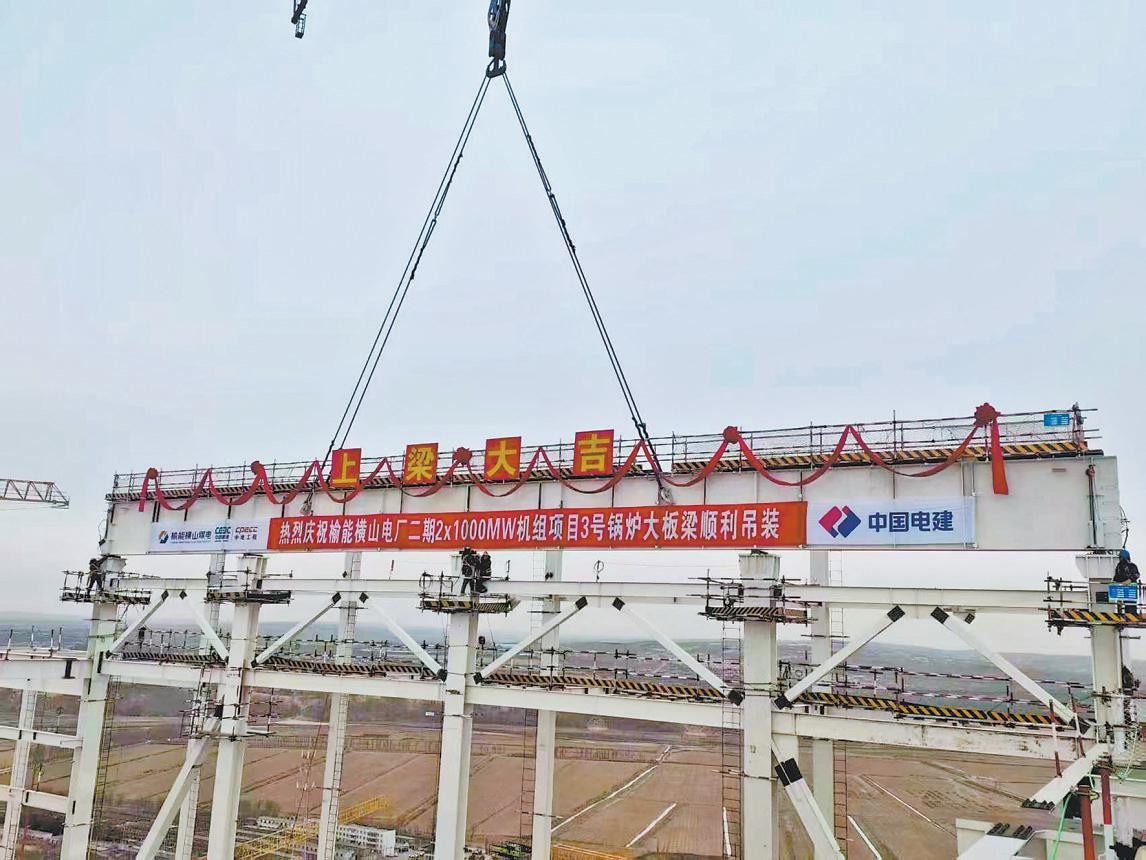 榆能横山电厂二期三号锅炉首根大板梁吊装开幕现场