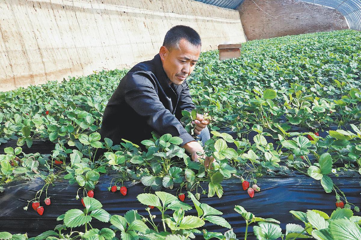 赵家砭村设施农业园区的日光温室大棚里,种植户正在打掐草莓拐枝。