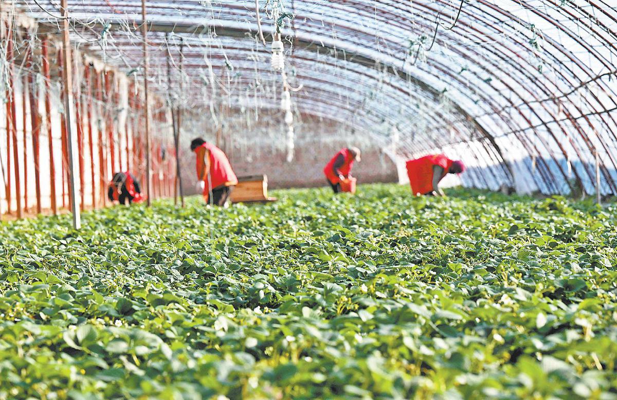 1月20日,在河北省石家庄市栾城区一家果蔬采摘园,农民在管护草莓。