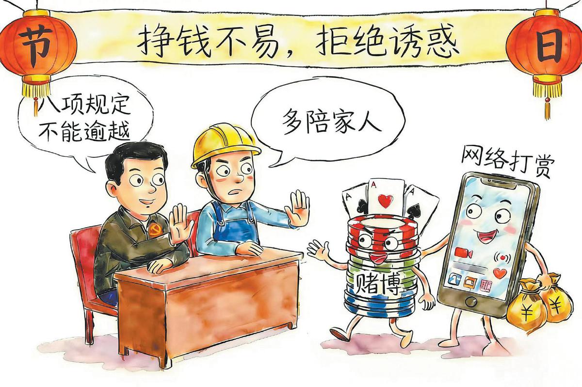 广大党员干部务必严于律己,树立理性消费观念,把握好休闲娱乐尺度,坚决对赌博、沉溺直播打赏等不良行为说“不”,更要发挥示范引领作用,带动家属及身边人远离低俗恶习,共同培育文明健康的节日风尚。